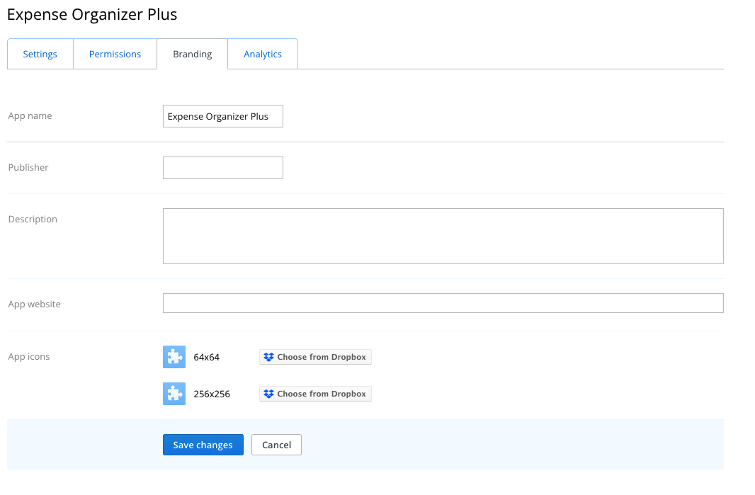 The Permissions tab allows you to enable and disable specific scopes for your app. The scopes enabled for your app determine what API functionality your app can use, such as reading file data, changing sharing settings, etc.